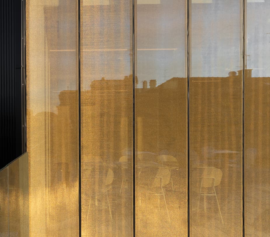 La scelta del colore oro non è stata puramente decorativa, ma funzionale a creare una presenza elegante e decisa, capace di emergere con garbo nel contesto urbano circostante. Il tessuto, integrato nei vetri, conferisce al prospetto un carattere incisivo e moderno, senza risultare invadente rispetto alla facciata originale dell’edificio.