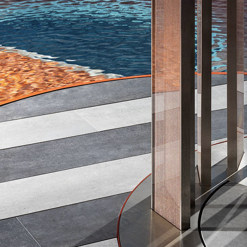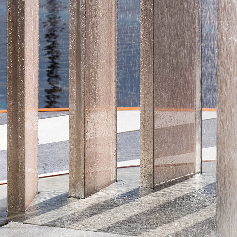 Per questo progetto, il nostro prodotto nella preziosa finitura rame è stato scelto per vestire con eleganza e rigore una serie di docce monumentali, realizzate con lamelle verticali in vetro stratificato.